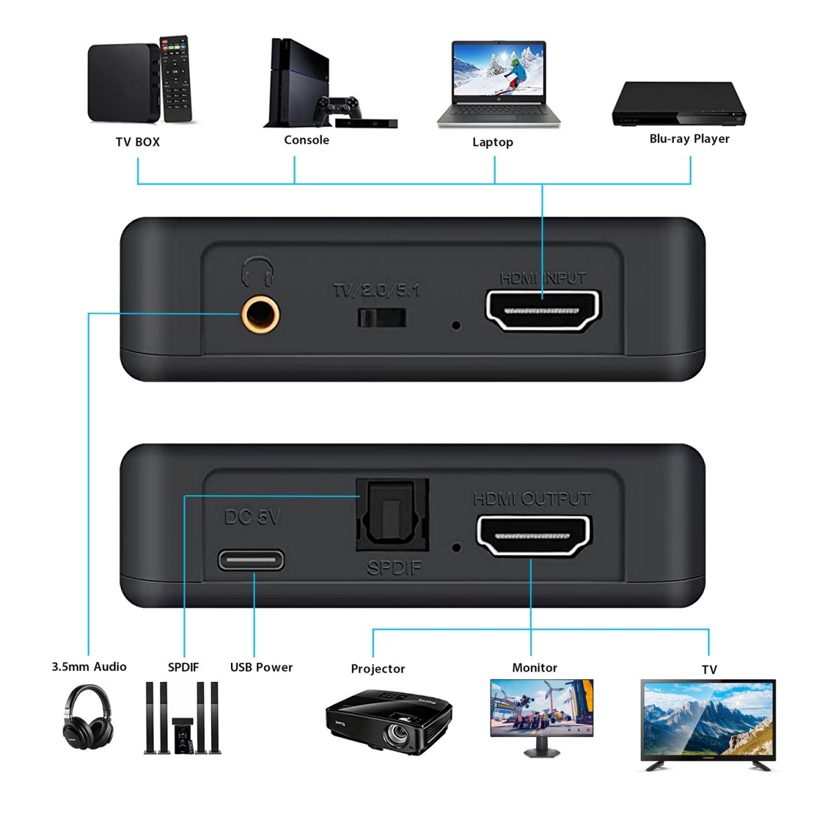 HDMI is capable of transmitting both video and audio signals through a single cable. However, in cases where we need to output audio to an external speaker system that has analog or optical input, this audio extractor serves as an ideal solution.