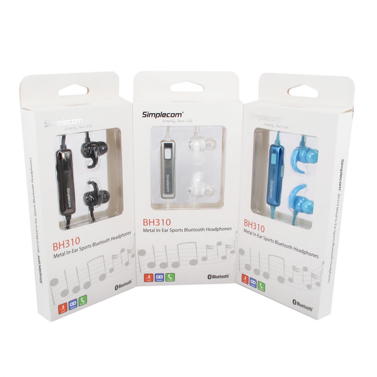 The Simplecom BH310 in-ear Bluetooth wireless stereo headset combines portability with premium sound quality. Metal earbuds help to deliver a full-range sound experience. Super-soft ear adapters in a choice of three sizes give you a perfect fit, and silicon wings for secure fit on your ears. The BH310 features magnetic earbuds, clip together to prevent cord tangles and falling out. In-line mic and volume control compatible with any mobile phones with Bluetooth.