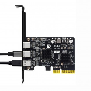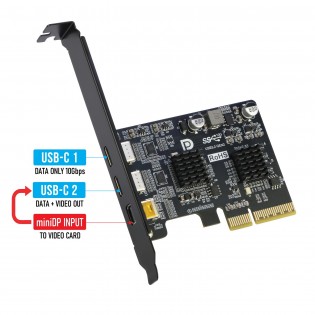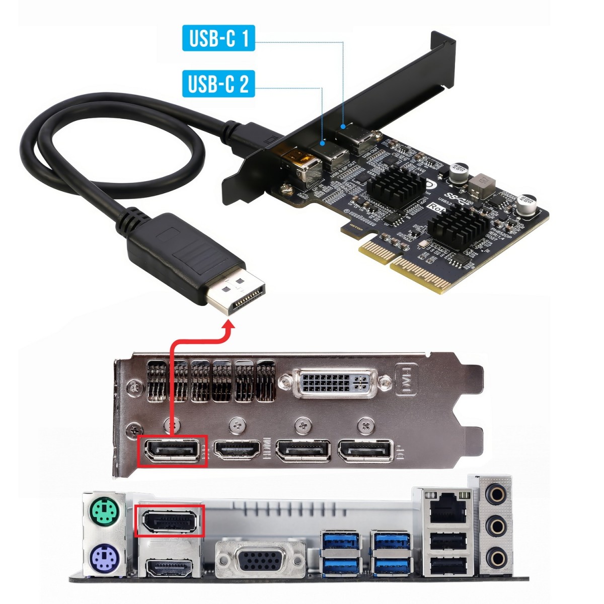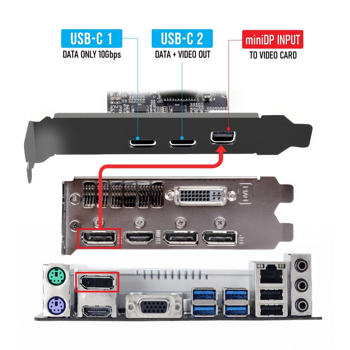 Upgrade your desktop PC with this 2-Port USB-C PCIe Expansion Card, designed to deliver high-speed data transfer and video integration through a single USB-C port. Featuring a mini DisplayPort input for video passthrough, it allows you to transmit video signals directly through the USB-C port, perfect for connecting to USB-C docking stations or USB-C monitors with display output capabilities.