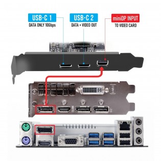 - The miniDP port must be connected to the DisplayPort output on your motherboard or graphics card, the video signal will then pass through to the USB-C 2 port.